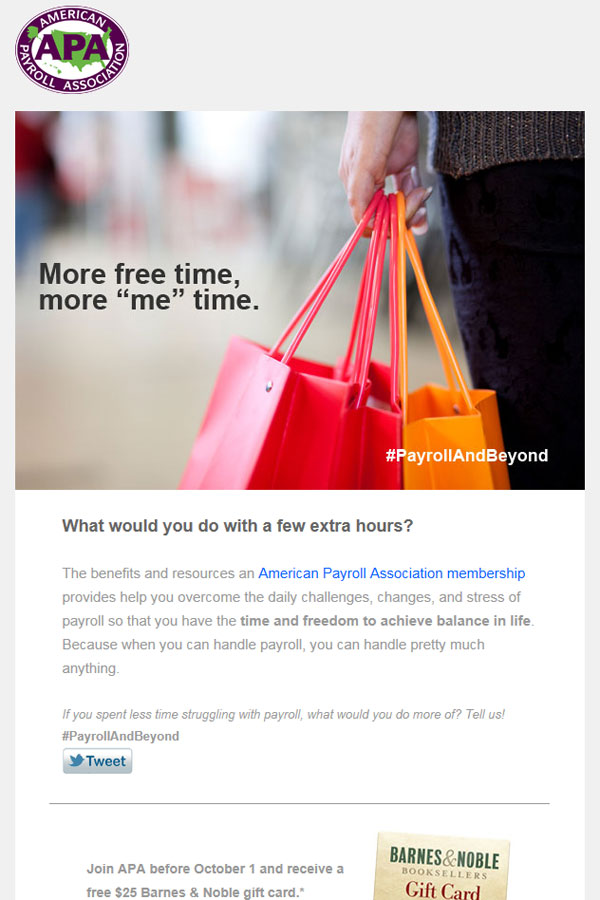 I wrote copy for email campaigns that showcased different scenarios to entice payroll professionals. The #PayrollAndBeyond hashtag to encourage them to interact through social media.