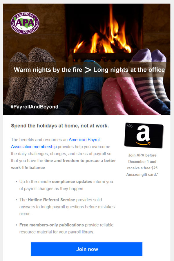 The American Payroll Association (APA) is a member-based organization that provides education and resources to payroll professionals. Their membership drives provide a bi-annual boost to revenue by increasing its member base.